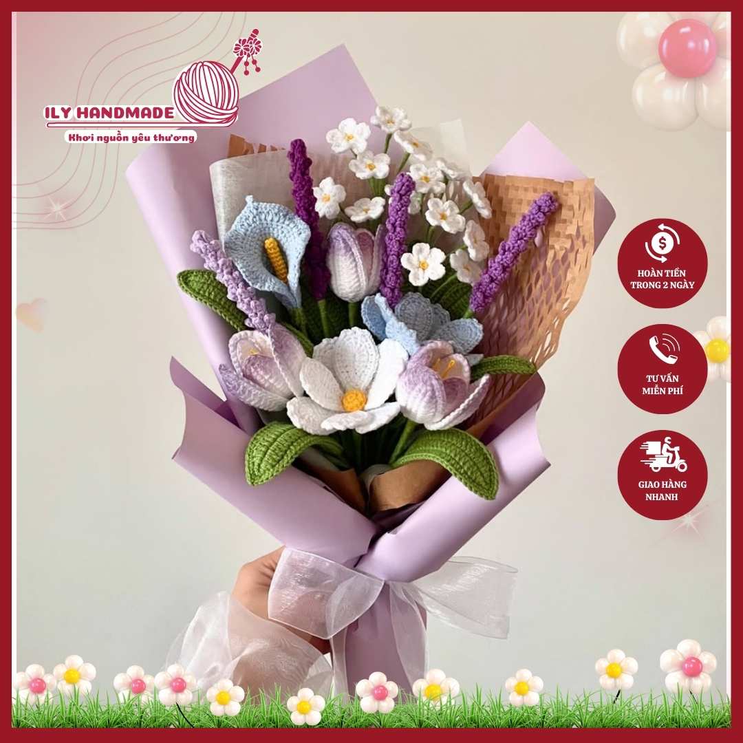 Bó hoa len “Sắc Tím Mộng Mơ” là tác phẩm nghệ thuật đầy tinh tế, kết hợp giữa những sắc tím ngọt ngào, trắng thuần khiết và xanh dịu nhẹ. Tất cả được móc tay tỉ mỉ bằng len cao cấp, tạo nên một bó hoa len độc đáo, nhẹ nhàng và mang đậm chất thơ.
